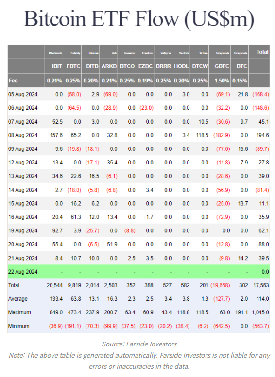 22일(현지 시간) 파사이드 인베스터스에 따르면 전일(수) 비트코인 ETF 전체적으로 3950만 달러가 유입됐다. 블랙록, 피델리티, 비트와이즈 등에 자금이 유입됐다. 그레이스케일이 수수료를 대폭 낮춰 출시한 그레이스케일 미니 비트코인 트러스트(BTC)도 1420만 달러 플러스 흐름을 기록했다. 반면 그레이스케일 비트코인 트러스트(GBTC)에서 980만 달러 빠져나갔다.