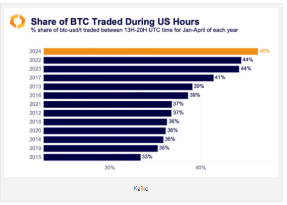 코인데스크는 22일(현지 시간) 데이터 분석 업체 카이코 차트를 인용, 금년 1월 ~ 4월 미국 거래 시간대 비트코인/USDT 거래 비중이 46%를 기록했다고 보도했다. 이는 데이터 집계가 시작된 2015년 이후 최고치다.
