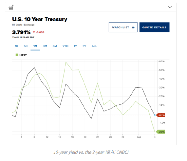 [뉴욕 = 장도선 특파원] 미국 국채 10년물과 2년물 수익률 곡선이 4일(현지 시간) 일시적으로 정상화되면서 경기침체 우려가 완화되는 것이 아니냐는 기대를 불러일으켰다.