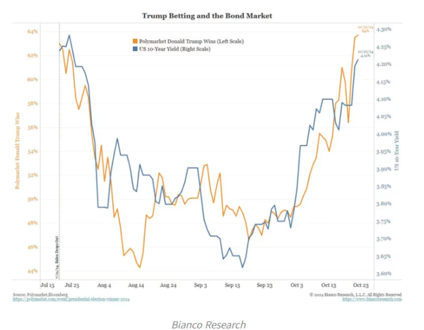 코인데스크는 22일(현지 시간) 미국 국채 10년물 수익률과 트럼프의 당선 가능성이 같은 방향으로 움직이는 것을 보여주는 비앙코 리서치의 차트를 소개했다. 차트에 따르면 10년물 수익률과 트럼프의 당선 가능성은 7월 중순 하락하기 시작했으며 9월 중순 함께 반등했다.