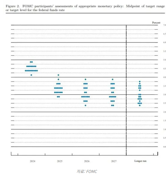 연준은 이번 금리 인하에 이어, 추가 인하 가능성을 시사했다. FOMC 위원들의 개별 예상치를 담은 ‘점도표(dot plot)’에 따르면, 올 연말까지 0.5% 포인트, 2025년 말까지 1% 포인트, 2026년에는 0.5%포인트가 더 인하될 것으로 예상했다. 이번 발표를 포함하면, 연준은 기준금리가 총 2%포인트가량 더 낮아질 것으로 예상했다.