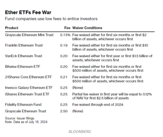이더리움 ETF의 출시는 1월에 미국의 비트코인 현물 ETF가 큰 화제를 모으며 수십억 달러의 유입을 기록한 후 이루어졌다. 이더리움 펀드가 얼마나 많은 자금을 유치할 수 있을지에 대한 예측은 다양하다. 윈터뮤트 분석가들은 1년 동안 유입될 자금이 48억 달러에서 64억 달러 사이일 것이라고 예측했지만, 실제 수요는 예상보다 낮을 수 있다고 경고했다. 블룸버그 인텔리전스의 분석가들은 이더리움 ETF의 유입 자금이 비트코인 펀드의 약 20% 수준일 것으로 보고 있다.