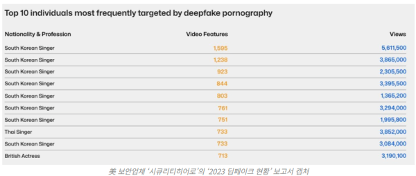 가장 큰 피해를 본 한국인 가수는 딥페이크 성착취물 1천595건에 등장했으며 총조회수는 561만회였다. 또 다른 한국 가수는 성착취물 1천238건의 표적이 됐고 조회수는 386만5천회에 달했다.
