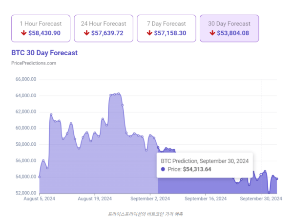 가격 예측 AI, “9월말 비트코인 5만4천 달러”–프라이스프리딕션