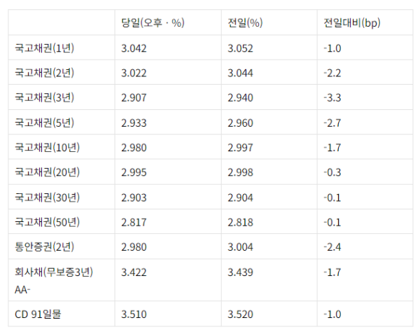 10년물 금리는 연 2.980%로 1.7bp 하락했다. 5년물과 2년물은 각각 2.7bp, 2.2bp 하락해 연 2.933%, 연 3.022%에 마감했다.