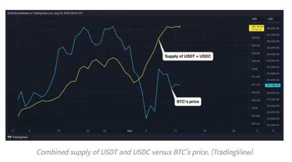 Combined supply of USDT and USDC versus BTC’s price. (TradingView)