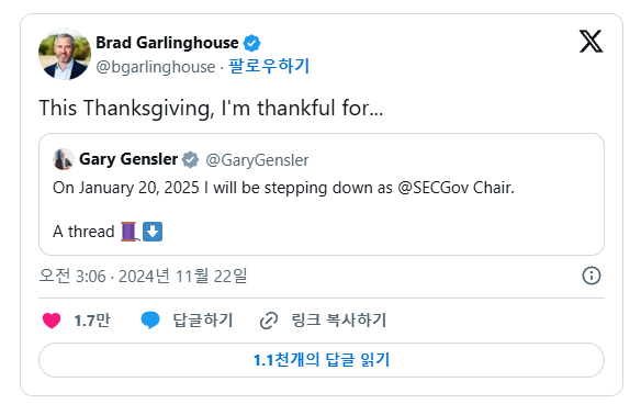SEC와 4년째 소송전을 벌이고 있는 리플 랩스(Ripple Labs) CEO 브래드 갈링하우스는 “이번 추수감사절에 나는 이 소식을 축하하고 싶다” 며 겐슬러의 사임 트윗을 공유했다.