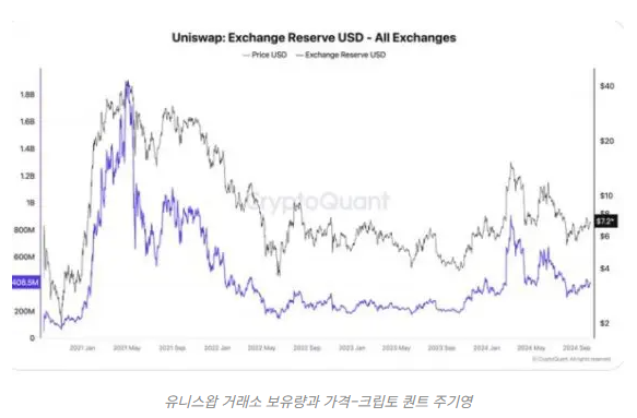 그는 “일부 프로젝트들은 보유자에게 가치를 제공할 수 있는 다양한 메커니즘을 활성화하는 데 신중한 태도를 보이고 있다. 대표적인 예로는 유니스왑(UNI)이 있다. 유니스왑이 수수료 전환 기능을 활성화했다면, 지금쯤 3억 1,400만 달러가 축적됐을 것이다. 현재 중앙화 거래소에 4억 800만 달러 상당의 UNI 토큰이 있으며, 이 보유금을 토큰 환매에 사용되었다면, 시장 깊이에 따라 가격이 10배에서 100배까지 상승할 가능성도 있었다”고 설명했다.