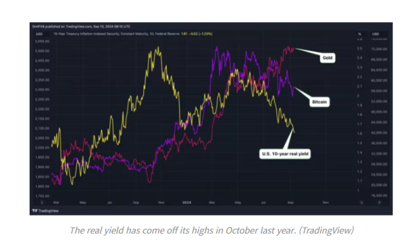 유럽중앙은행(ECB)의 금리 인하에 이어 연방준비제도(연준)의 금리 인하가 가까워지면서, 경제 전문가들은 추가 유동성 공급과 금리 인하가 비트코인 시장에도 긍정적인 영향을 미칠 수 있다고 전망했다. 비트와이즈의 유럽 연구 책임자인 안드레 드라고슈는 “금값 상승은 미국 국채 실질 수익률이 급락할 가능성을 시사하며, 이는 투자자들이 다시 비트코인과 기술주 같은 위험 자산으로 자금을 돌리게 할 수 있다”고 말했다.