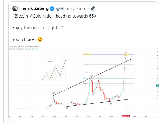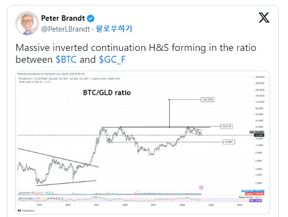 유명 차트 분석가이자 트레이더인 피터 브랜트가 금에 대비한 비트코인 가격이 급등할 전망이라는 차트를 공유했다.