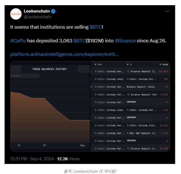 암호화폐 시장 움직임을 추적하는 플랫폼 룩온체인(Lookonchain)은 4일(현지 시간) 엑스(트위터)에 “기관들이 비트코인을 매도하고 있는 것 같다”는 글을 올렸다. 룩온체인은 또 세푸(Ceffu)가 8월 26일 이후 3063 BTC($1억8200만)를 바이낸스에 예치했다고 덧붙였다.