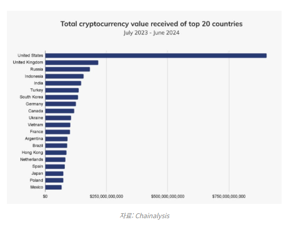2023년 7월부터 2024년 6월까지 이 지역은 1조3000억 달러의 온체인 가치를 창출하며 전 세계 암호화페 총액의 22.5%를 차지했다. 특히 100만 달러 이상 대규모 거래의 70%가 미국에서 이루어지며 시장 지배력을 입증했다.