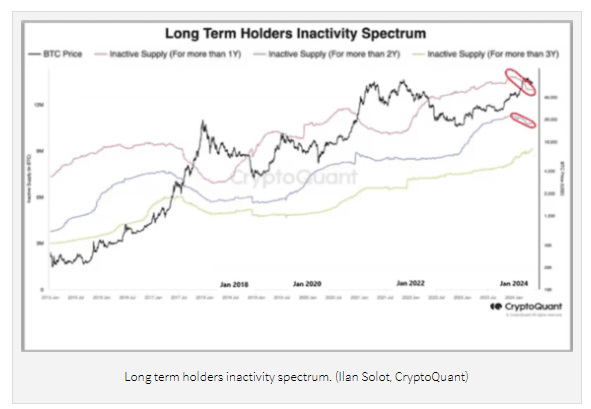크립토퀀트 데이터는 최소 12개월과 2년 동안 활동이 없던 비트코인의 수가 감소했음을 보여준다. 이는 비트코인 가격이 사상 최고치에 접근하면서 보유자들이 이익을 실현했다는 신호다.