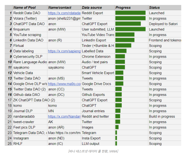 바나의 생태계는 두 가지 주요 참여 방식으로 구성된다. 첫 번째는 데이터를 보유한 누구나 데이터 다오(DataDAO)에 참여해 데이터를 기여하고 보상을 받을 수 있다는 것이다. 현재 목샤(Moksha) 테스트넷에서 16개의 데이터 다오가 운영 중이며, 사용자는 미리 참여 자리를 예약할 수 있다.