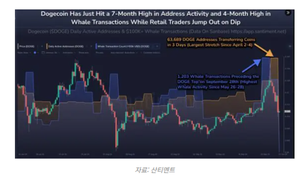 도지코인의 향후 움직임을 이해하기 위해서는 ‘고래’라 불리는 대형 투자자들의 반응이 중요하다. 9월 28일 도지코인이 0.13달러에 도달하기 전, 5월 이후 최대 고래 활동이 나타났다.