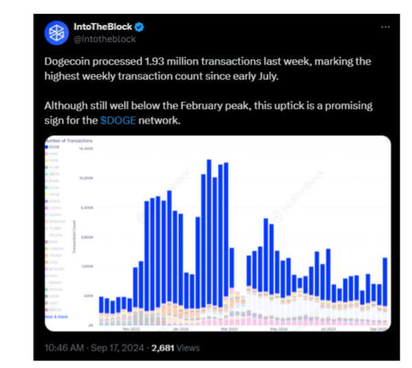 인투더블록(IntoTheBlock)에 따르면 시바견을 모티브로 한 도지코인은 최근 한 주 동안 193만 건 이상의 거래가 발생했다. 이는 인기 있는 다른 밈코인인 시바이누(SHIB), 플로키(FLOKI), 페페(PEPE) 등을 제치고 가장 높은 거래량을 기록한 것이다.