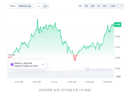 뉴욕 시간 16일 오후 1시 30분 도지코인은 코인마켓캡에서 0.126 달러로 24시간 전 대비 4.63% 올랐다.