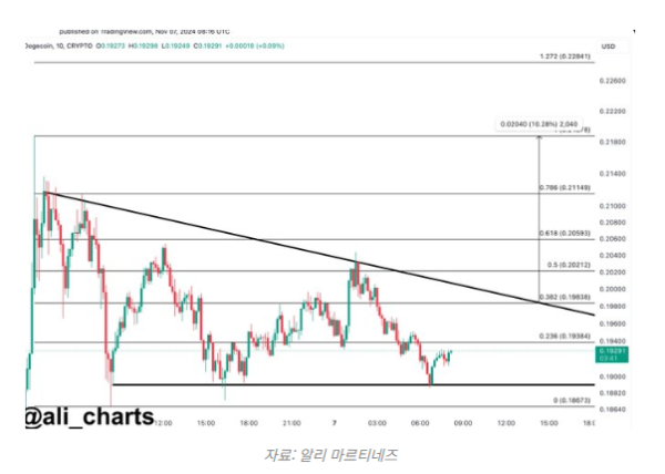 암호화폐 분석가 알리 마르티네즈는 도지코인이 현재 하락 삼각형 패턴 내에서 다지기 중임을 지적하며, 0.198달러의 저항선을 돌파할 경우 0.22달러까지 상승할 가능성이 있다고 내다봤다.