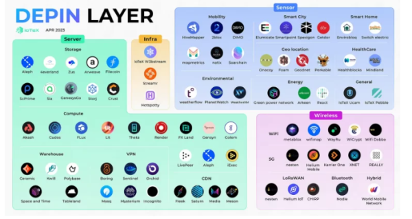 다른 디핀의 예로는 렌더(Render), 라이브피어(Livepeer), 아카시(Akash) 헬륨(Helium), 등이 있다. 현재 알려진 부분은 암호화폐 분야지만 실제 경제의 가치는 수 백조 달러로 평가되고 있다. 메사리(Messari)는 보고서를 통해 디핀 분야는 2028년까지 ~$3.5조에 달할 수 있다고 전망했다.