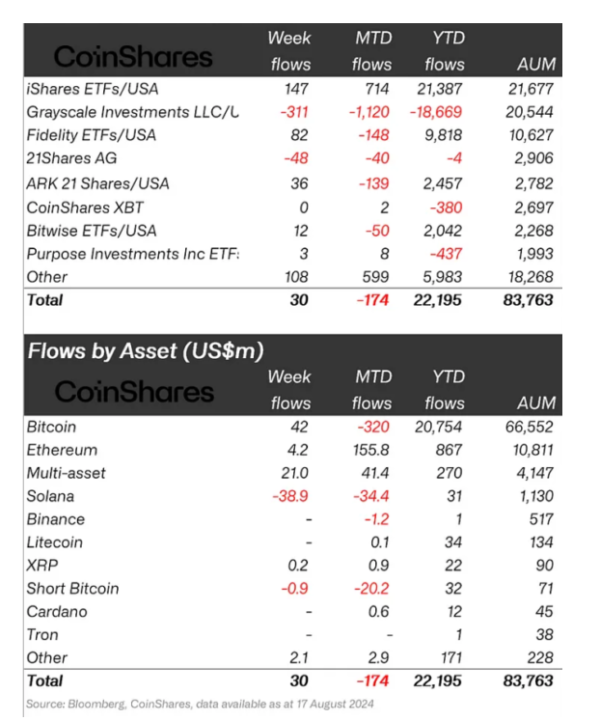19일(현지 시간) 코인셰어스에 따르면 8월 17일 기준으로 이전 한 주 동안 전체 암호화폐 펀드에 3000만 달러가 유입됐다. 2주 연속 플러스 흐름이 유지됐지만 직전주 1억7600만 달러에 비해 순유입 규모는 크게 축소됐다.