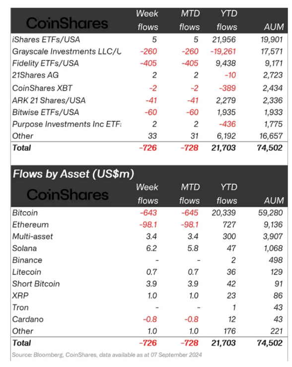 지역별로는 미국에서 거래되는 암호화폐 펀드에서 7억2100만 달러가 빠져나갔다. 이는 최근 미국 증시에 상장된 비트코인과 이더리움 현물 ETF의 자금 유출 추세와 일치한다.