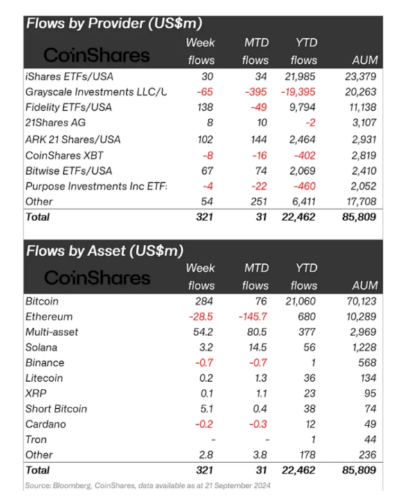 23일(현지 시간) 코인셰어스 주간 보고서에 따르면 9월 21일 기준으로 이전 한 주 동안 전체 암호화폐 펀드에 3억2100만 달러가 유입됐다. 연방준비제도(연준)의 지난주 50bp 금리 인하가 디지털 자산 펀드로의 자금 유입을 유도한 주된 요인으로 지적됐다.