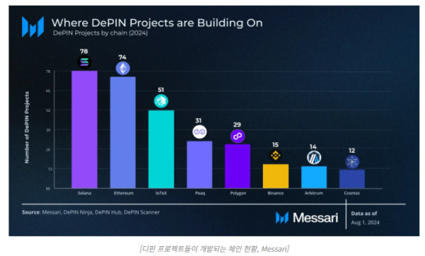 디핀 프로젝트 개발 체인에서는 솔라나(Solana)가 약 78개의 프로젝트로 선두를 달리고 있다고 알려졌다. 이외 아이오텍스와 피크(Peaq)와 같은 디핀 중심의 레이어 1 네트워크들도 생태계를 확장하고 있다.