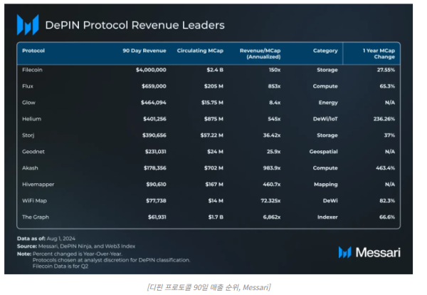 하지만 시장 가치의 급성장에도 불구하고, 디핀 섹터의 수익은 여전히 저조한 상태다. 상위 8개 디핀 프로토콜 중 매출 기준으로 상위권에 속하는 프로토콜은 4개에 불과했다. 이는 디핀 시장이 여전히 수요 제약을 받고 있음을 나타낸다.