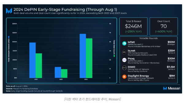 메사리에 따르면 디핀 시장은 급격한 성장을 보이고 있다. 디핀 관련 펀딩 규모는 전년 대비 296% 증가했으며, 전체 시장 가치는 400% 상승해 200억 달러에 도달했다. 그러나 이와 같은 성장에도 불구하고 수익성 문제는 여전히 해결되지 않은 상태다.