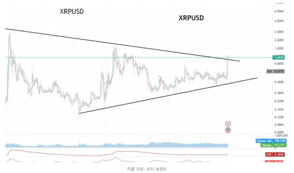 피터 브랜트는 “리플 가격이 도약할 준비를 마쳤다”고 설명했다. 대규모 응축 기간을 거쳤으며 2023년 최고치도 갱신했다고 말했다.