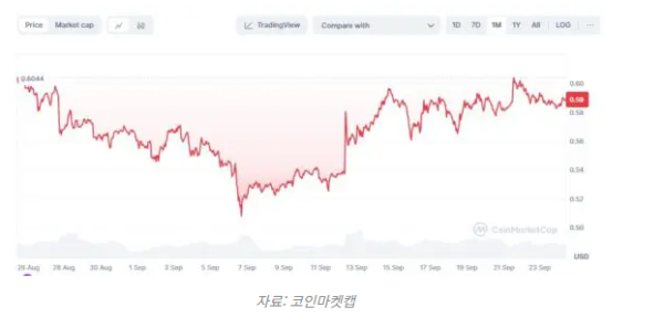 코인마켓캡에서, 뉴욕시간 오전 XRP는 지난 24시간 동안 0.84% 오른 0.59 달러에 거래되고 있다. 23일 2억 XRP 매도 이후 0.58달러까지 하락했다가 소폭 회복한 수준이다.