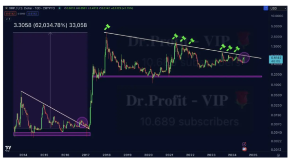 유명 크립토 애널리스트 ‘Dr. Profit’은 XRP가 6.5년간 형성된 대칭 삼각형 패턴 내부에서 중요한 저항선을 테스트 중이라고 지적했다. Dr. Profit은 저항선인 $0.72를 돌파할 경우 2017년에 본 것과 같은 상승을 기대해 볼 수 있다고 언급했다.