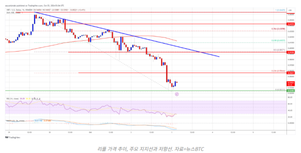 XRP가 0.5565달러 저항 구간을 돌파하지 못할 경우 추가 하락할 수 있다. 초기 하락 지지선은 0.530 달러이며, 다음 주요 지지선은 0.5240 달러이다.