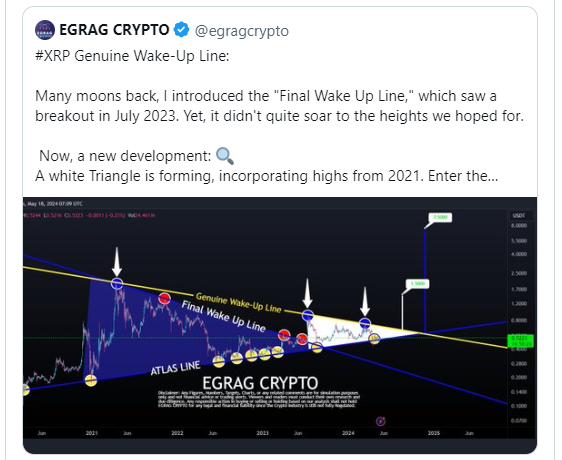 이그래그는 23일자 엑스 포스팅에서 “XRP이 1 달러 아래에서 거래되고 있으나, 곧 상승세를 보일 것” 이라고 분석했다. 그는 XRP가 주요 저항선을 돌파하면 7.5달러까지 오를 수 있다고 강력하게 주장하고 있다.