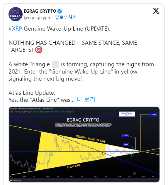 이그래그는 이 삼각형의 상단 경계를 “진정한 각성”으로 지목했다. 이 상단 경계는 XRP가 강한 상승세를 보일지, 아니면 현재의 변동성을 지속할지를 결정할 중요한 저항선이다.