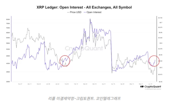 크립토퀀트의 시장 분석가(Woominkyu)에 따르면 리플 미결제약정(Open Interest, OI)이 증가하고 있다. 이는 리플 가격상승을 기대하는 투자자들의 거래활동이 활발해 지고 있음을 의미한다.