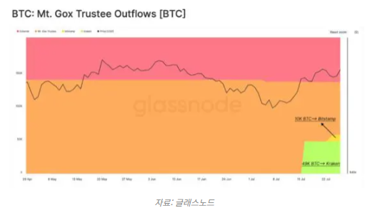 글래스노드 데이터에 다르면, 7월 24일 현재 마운트곡스 채권자에게 지급해야 할 총 비트코인의 41.5% 이상이 배분됐다. 이는 14만1686 BTC 중 약 5만9000 BTC에 해당하며, 약 40억 달러에 달하는 금액이다.