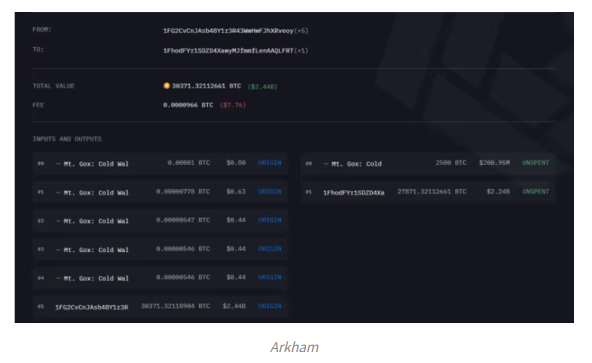 마운트곡스 신탁관리인은 기존 지갑인 “1FG2C…Rveoy”에서 새로운 지갑인 “1Fhod…LFRT”로 3만개 넘는 BTC를 이체했으며, 2억 달러는 별도의 콜드월렛으로 이동시켰다. “1FG2C…Rveoy”는 지난주 이뤄진 마운트곡스의 비트코인 이동 때 가장 많은 비트코인을 전송받은 지갑으로 보도된 바 있다.