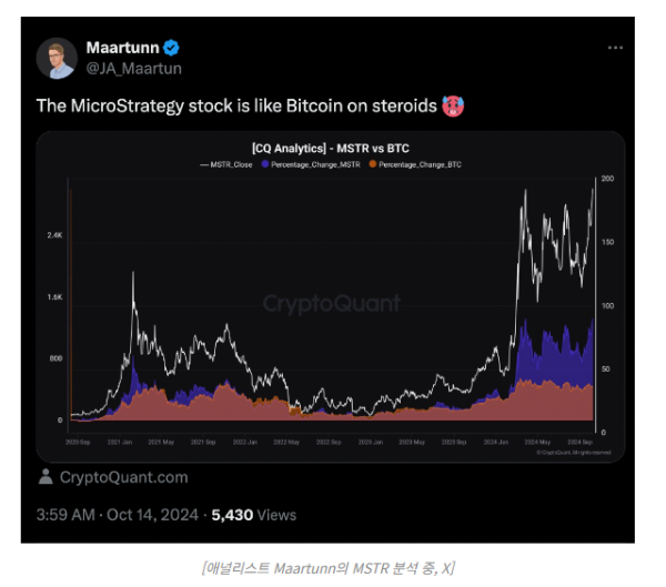 CEO 마이클 세일러(Michael Saylor)의 공격적인 비트코인 매입 전략에 대한 시장의 신뢰도 높다. 마이크로스트래지는 2020년 8월 비트코인을 주요 자산으로 채택한 이후 비트코인 및 전통 주식 대비 꾸준히 높은 성과를 보였다.