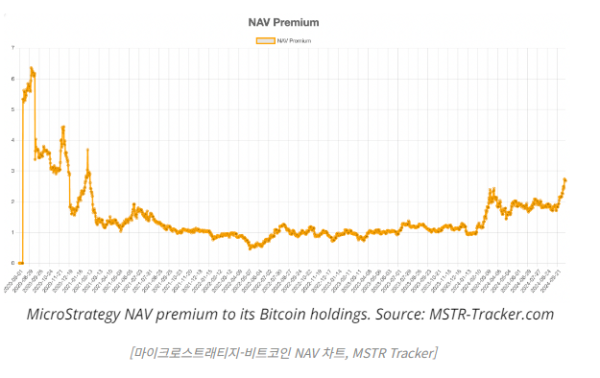 NAV 프리미엄은 MSTR의 시가총액을 비트코인 보유량으로 나눈 값으로 측정된다. 이 값이 높을수록, MSTR 주식을 보유한 투자자들은 비트코인을 직접 보유하는 것보다 2.7배 높은 수익을 얻었음을 의미한다.