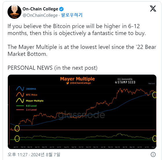 암호화폐 정보 플랫폼인 온체인 컬리지(On-Chain College)는 7일 X 에서 “비트코인 가격이 6~12개월 내에 오를 것이라고 믿는다면 지금이 객관적으로 구매하기 좋은 시점”이라고 언급했다. 이들은 메이어 멀티플 차트를 인용해 이 같은 의견을 제시했다.