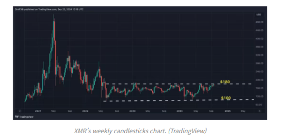 차트 플랫폼 트레이딩뷰에 따르면 모네로는 2022년 6월 이후 범위 내 횡보 움직임을 이어왔으며 수 차례 180 달러 저항선 돌파를 시도했으나 실패한 뒤 가파른 후퇴를 경험했다. 모네로의 하락은 약 100 달러 부근에서 저지됐다.