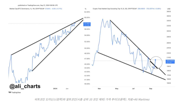 마르티네즈는 비트코인의 시가 총액 점유율이 약세 신호를 보이며 잠재적으로 하락할 가능성이 있다고 했다. 반면, 상위 10개 코인을 제외한 모든 코인의 시가 총액은 하락세에서 상승세로 전환했다며 흥미로운 상황이라고 말했다.