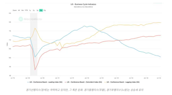 컨퍼런스 보드의 선행 지표는 하락세를 보이고 있지만, 현재 경제 상태를 나타내는 동행 지표와 후행 지표는 상승하고 있다.