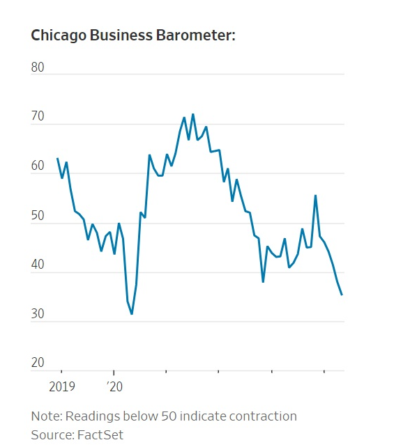 시카고 구매관리자 지수는 5월 35.4로 4월의 37.9에서 하락했다. 이 지수는 팬데믹 봉쇄 기간이었던 2020년 5월 이후 최저치를 기록했다.
