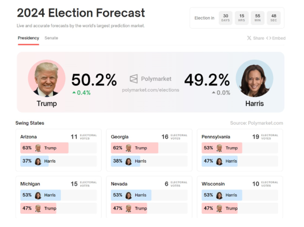 [블록미디어 James Jung 기자] 미국 대통령 선거가 한 달 앞으로 다가왔다. 민주당의 해리스, 공화당의 트럼프 두 후보 간 격차는 오차 범위 이내로, 사실상 동률이라는 분석이 지배적이다.