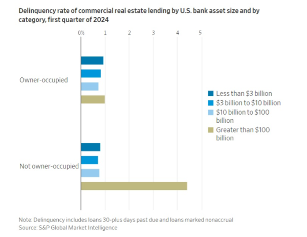 지금까지 상업용 부동산 대출 문제는 소형 은행의 문제로 여겨졌으나, 대형 은행들이 더 큰 타격을 받고 있다. 특히 임대 목적으로 사용되는 부동산 대출에서 두드러진다.