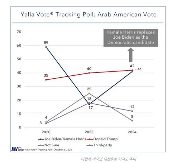 아랍아메리칸연구소(AAI)가 500명의 아랍계 미국인을 대상으로 지난달 9~20일 실시해 2일(현지시간) 공개한 여론조사에 따르면 다자 가상 대결 조사에서 전체 응답자의 42%는 공화당 대선후보인 도널드 트럼프 전 대통령을, 41%는 해리스 부통령에게 각각 투표하겠다고 답했다.