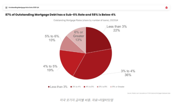리얼터닷컴(Realtor)에 따르면 모기지의 절반 이상이 실질금리 4% 이하입니다. 4분의 3은 5% 이하입니다. 미국 모기지는 보통 30년 짜리인데요. 기준이 되는 미국 국채 30년은 금리가 7%입니다.