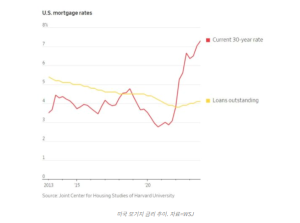 지금 당장 집을 사려면 7%를 기준으로 자신의 신용도를 감안해서 모기지 금리를 정하게 됩니다. 따라서 기존에 집을 가지고 있는 집 주인들은 이사를 하지 않으려 합니다. 같은 규모의 집으로 이사를 하더라도 모기지 금리가 4%에서 7% 이상으로 올라갈테니까요.